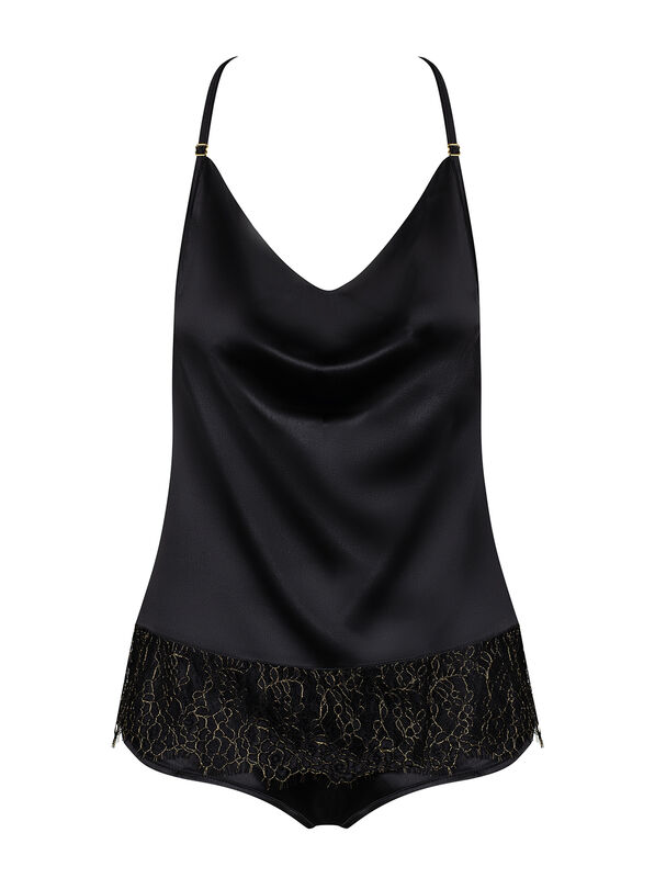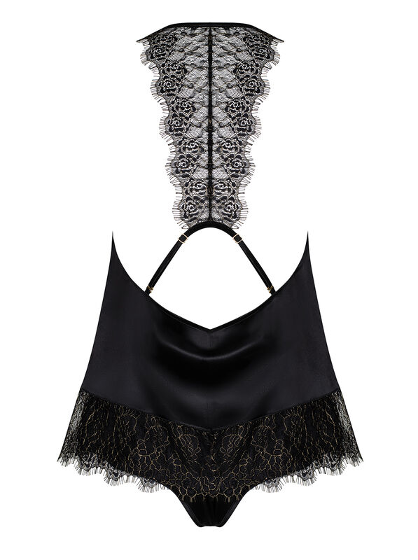 Momentos cheios de prazer são algo que você encontra no conjunto Agatya! O intrigante cetim preto no qual você se derreterá de prazer fará com que você se lembre das noites que passou com a sua amada com um rubor no rosto.