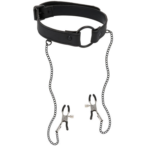 O colar de couro tem um anel robusto para conectar uma alça e, assim, manter o seu assunto bem protegido. Os clipes nos mamilos são conectados ao colar com correntes de metal.
