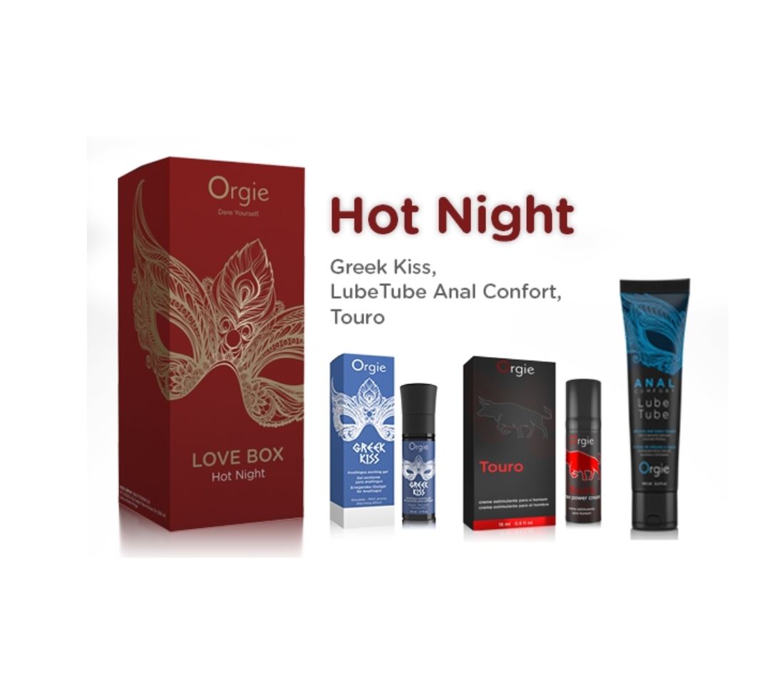 Love Box Hot Night contém 3 embalagens: um gel íntimo para sexo anal oral grego Kiss 50 ml + um lubrificante anal LubeTube Anal Comfort 100 ml + um creme estimulante para o homem Touro 15 ml.