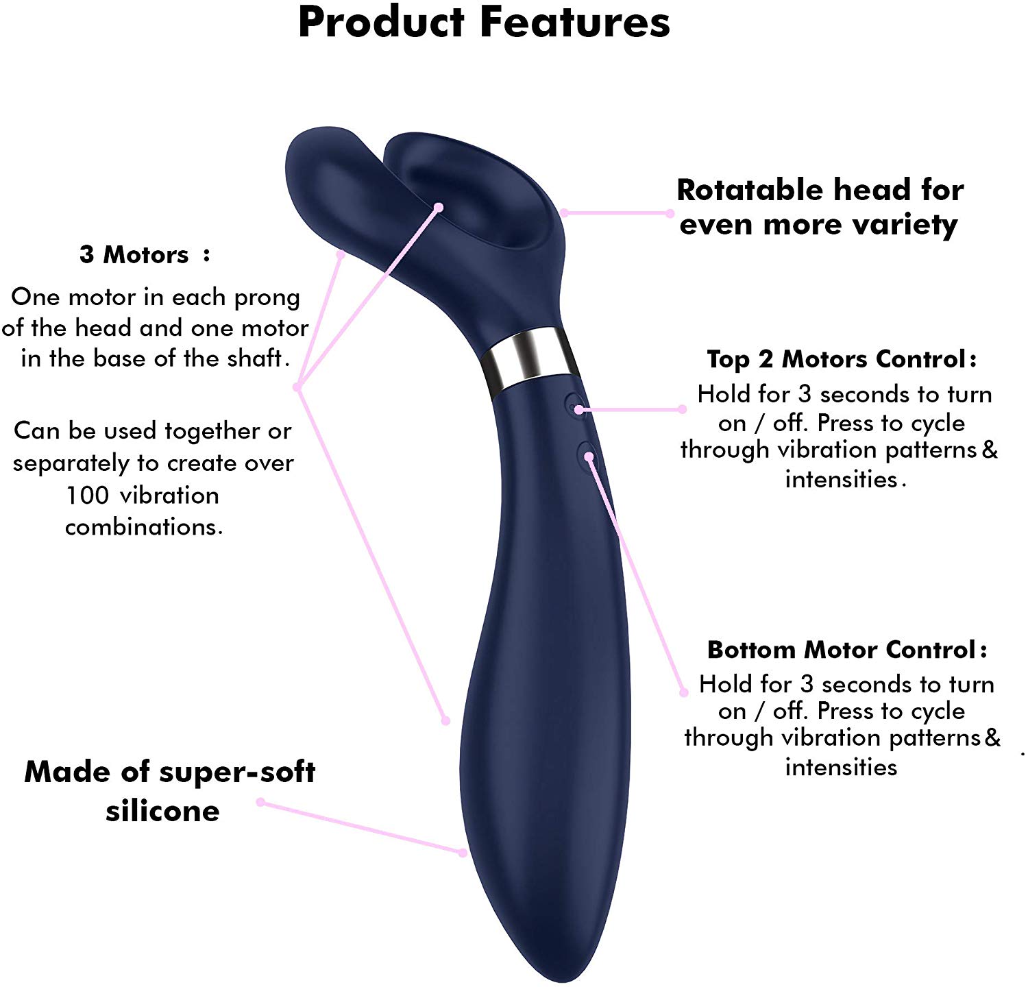 Graças aos seus 3 motores, você pode desfrutar de mais de 100 combinações de vibração e 32 possibilidades de uso, sem precisar se preocupar com as baterias, pois é recarregável por USB.