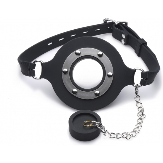 O plugue é conectado por uma corrente para que você nunca o perca. A abertura é de 3,81 cm para acomodar a possibilidade de penetração forçada.